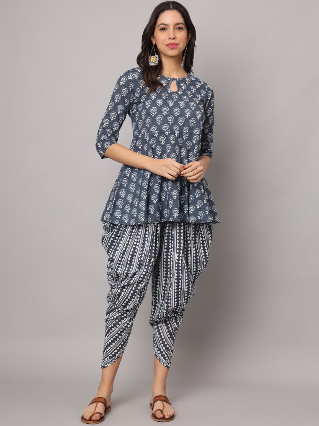 Floral Printed Keyhole Neck Pure Cotton Anarkali Kurti With Dhoti Pants